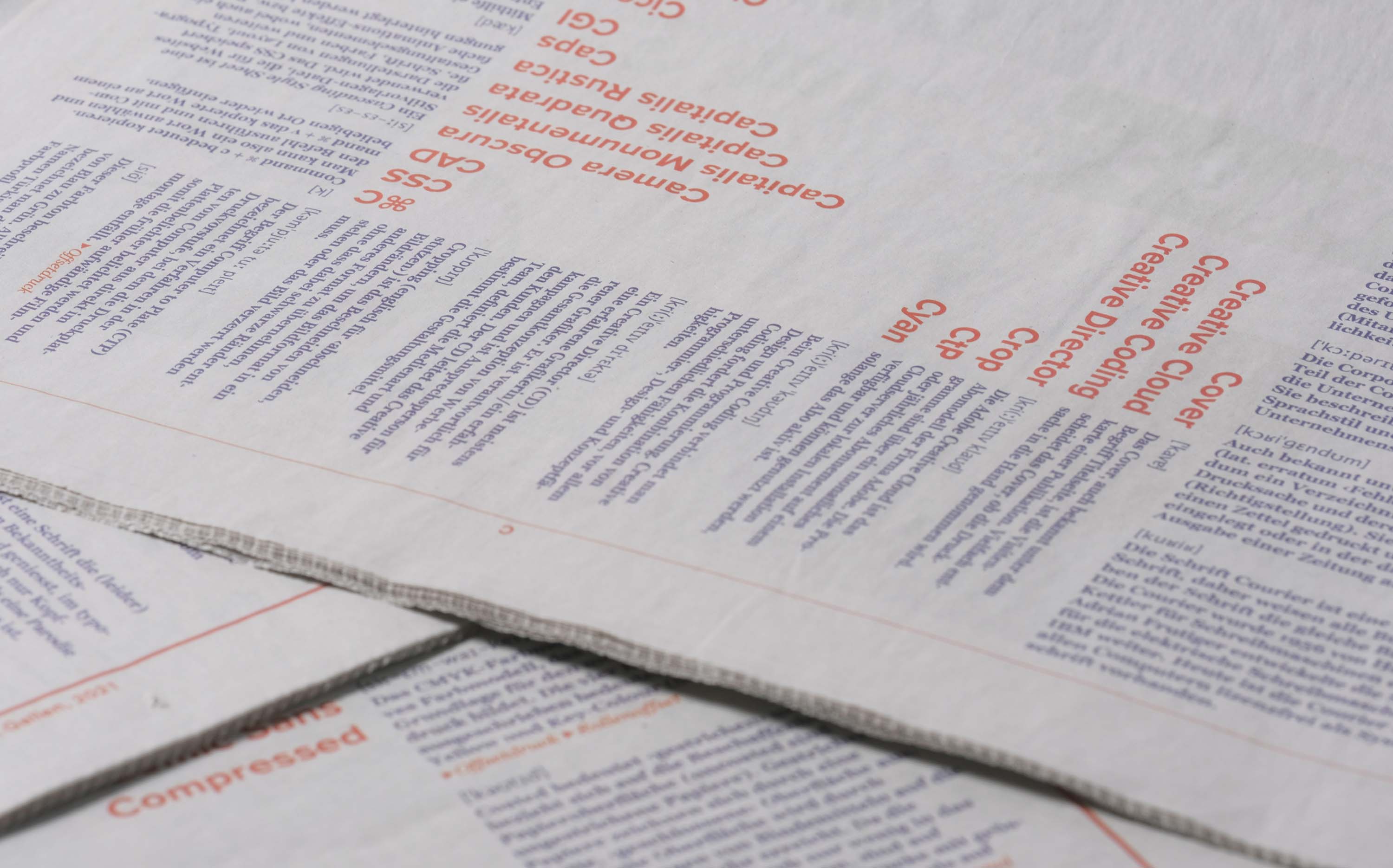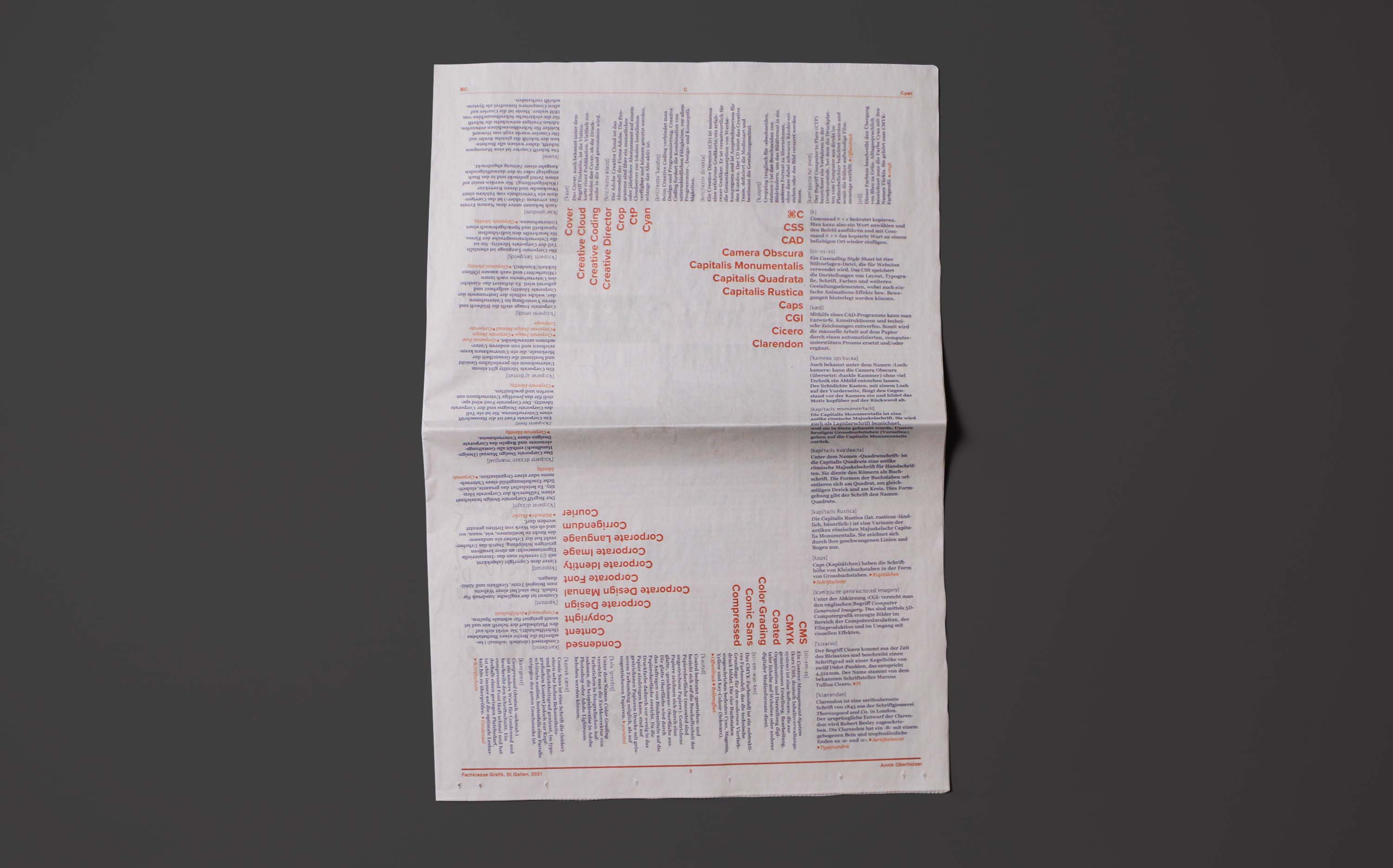 Ein Glossar in Zeitungsform mit den wichtigsten Fachbegriffen der Schweizer Grafik, ausgeführt anhand des Buchstabens C, wo Begriffe wie CMYK oder CMS erklärt werden. Mein Layout spielt mit dem Weissraum, der die Aufmerksamkeit auf sich zieht. Die Typografie bildet den Gegenpol dazu. Die fett gesetzten Titel wurden mit einer feinen, serifenbetonten Schrift ergänzt. Das klare Design lässt die Details der Typografie stark zur Geltung kommen. Zusätzlich zur Print-Umsetzung werden die einzelnen Begriffe via Artivive-App zum Leben erweckt. Zum Begriff CMYK beispielsweise habe ich eine After Effects-Animation erstellt, in der sich die Farben mischen und so das Prinzip erklärt wird.